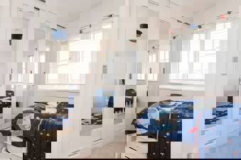 As many parents know, as their children get older, more and more things accumulate. Toys, clothes, shoes, sport equipment, art supplies, costumes, you name it! Luckily, with some clever storage, more items can be neatly tucked away, even within a small bedroom. Chests or ottomans for toys that sit at the end of the bed are great; with an upholstered top this acts as an extra seat to help get dressed as well as store games. Bespoke designed multi-use furniture can be worth their weight; desks create a space for homework while the drawers are great for storing items. What’s more, floor to ceiling sliding wardrobes are a great space saving solution for maximum storage.