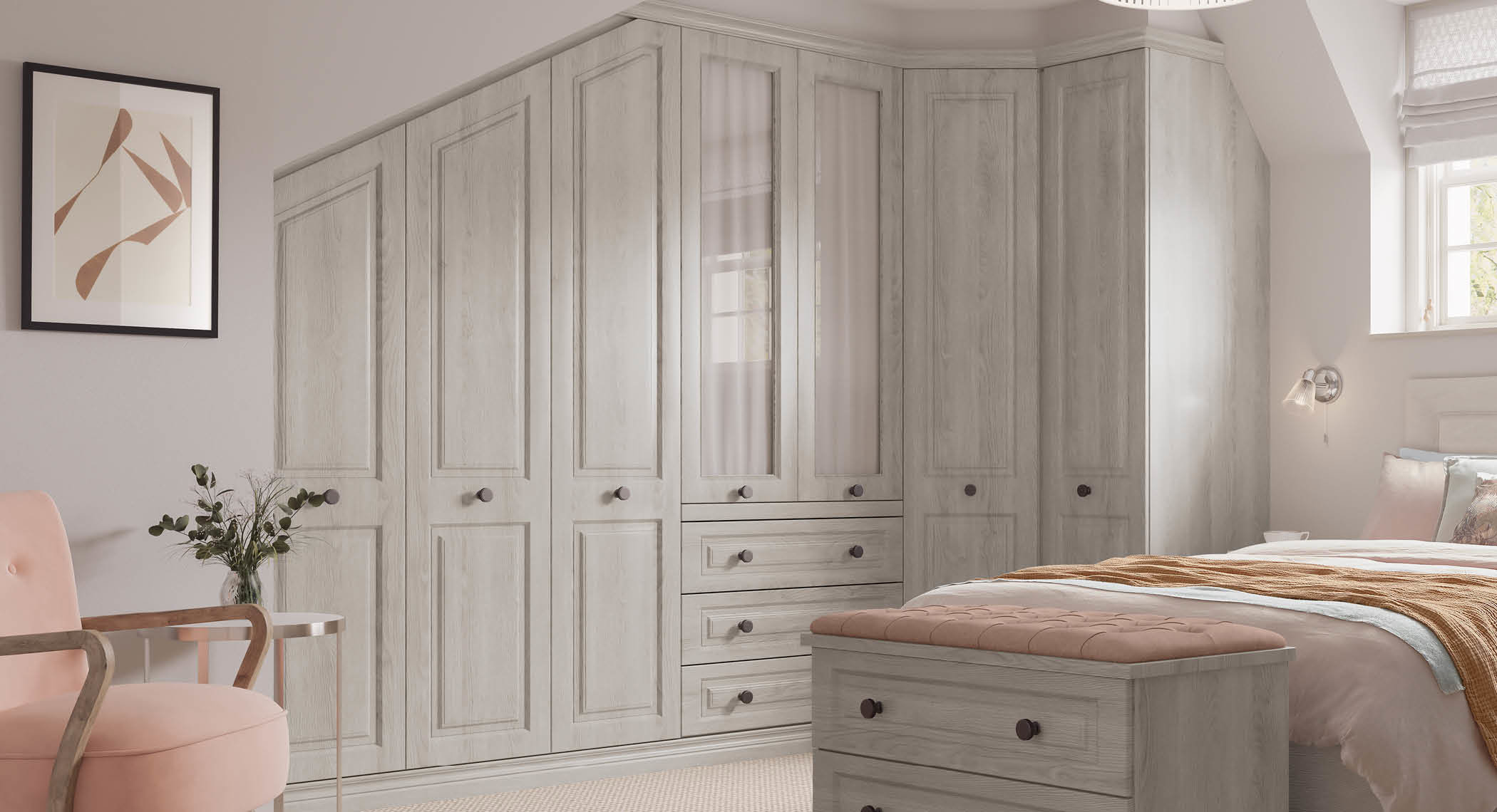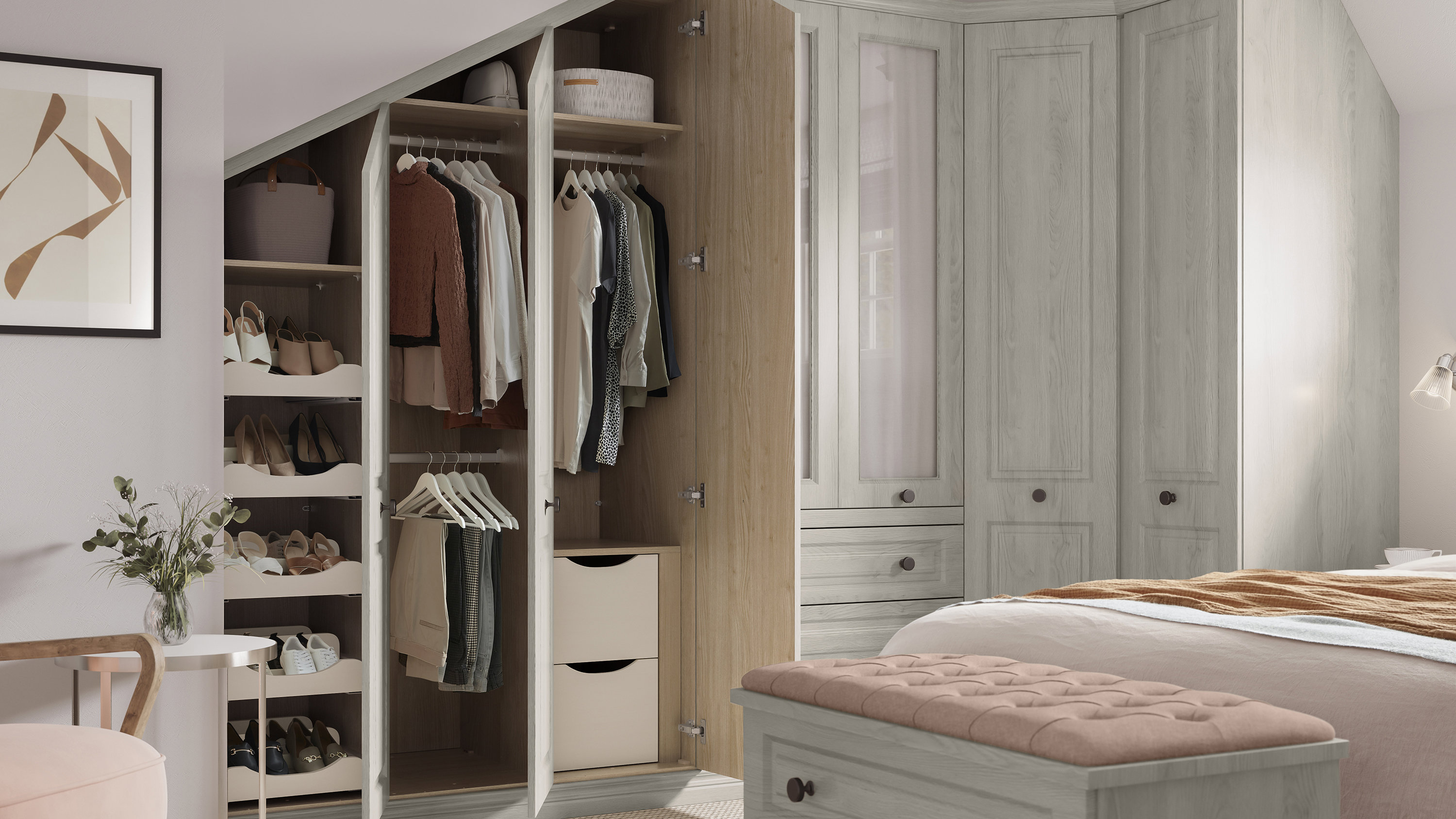 Designed for sloping ceilings and restricted headroom, our built in end-angled wardrobes bring you all the benefits of a full-sized unit and maximise your bedroom storage.