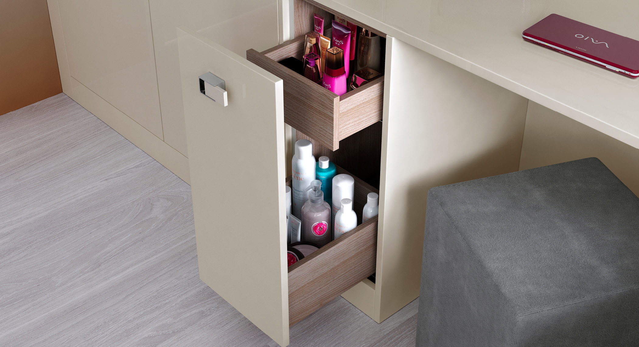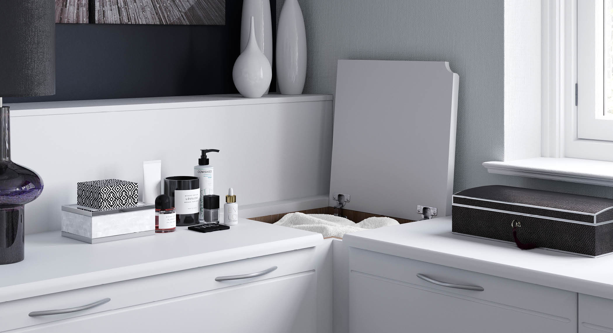 Unique to Hammonds, this concealed cosmetic drawer has room for all your beauty essentials – ensuring surfaces stay beautifully clutter-free.
