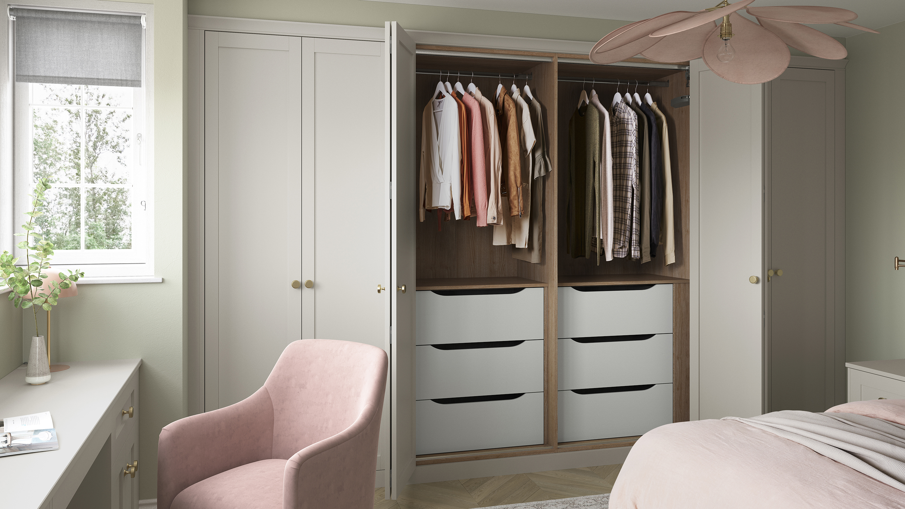 We understand the benefits that storage can have on your life. That’s why our selection of storage options has been expertly designed to offer you a cleverly curated space that works for you. Single or double hanging rails, strong soft-closing drawers and custom-spaced shelves build a brilliant bespoke base for optimum wardrobe storage. The option of pull-out shoe racks, jewellery trays, cosmetic units and a hidden tea tray add a touch of personalisation for your favourite pieces.