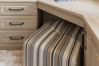 Floor to ceiling furniture made the most out of the space available with long inset lines that accentuate the space. A matching dressing table and mirror fitted neatly into the corner and provides a beautiful area to prepare for the day ahead but also some handy low level storage. A soft cube in exclusive Hammonds Mitra Ebony fabric was crafted as a soft furnishing addition, all part of the Hammonds service available. Overhead spot lights give a modern touch paired with chrome bedside lamps. fitted bedside cabinets with low level drawers provides even more storage within this space and matches seamlessly.